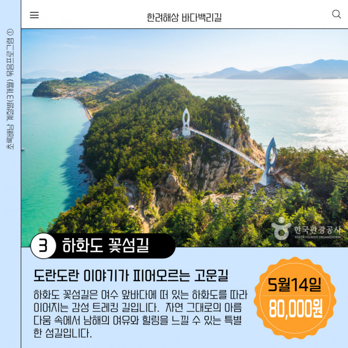 3/12 매물도 해품길, 4/9 비진도 산호길, 5/14 하화도 꽃섬길 (묶음상품으로 결제시 10%할인)
